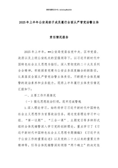 【七哥公文】2025年:【七哥公文】2025年上半年公安局班子成员履行全面从严管党治警主体责任情况报告+更多免费公文+VX:QiGeGongWen2024+更多免费公文+VX:QiGeGongWen2024