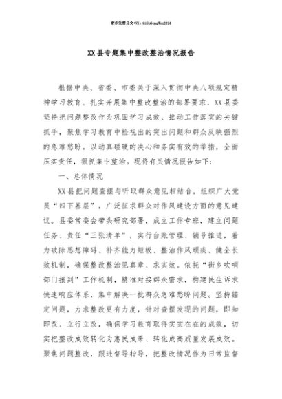 【七哥公文】2025年:【七哥公文】XX县专题集中整改整治情况报告+更多免费公文+VX:QiGeGongWen2024+更多免费公文+VX:QiGeGongWen2024