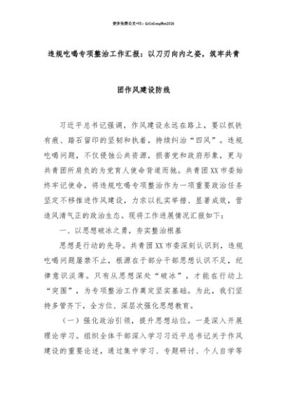 【七哥公文】2025年:【七哥公文】违规吃喝专项整治工作汇报:以刀刃向内之姿,筑牢共青团作风建设防线+更多免费公文+VX:QiGeGongWen2024+更多免费公文+VX:QiGeGongWen2024