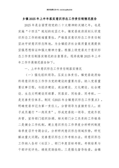 【七哥公文】2025年:【七哥公文】乡镇2025年上半年落实意识形态工作责任制情况报告+更多免费公文+VX:QiGeGongWen2024+更多免费公文+VX:QiGeGongWen2024