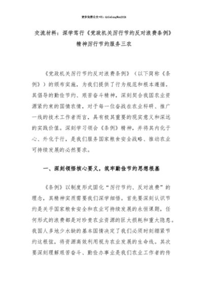 【七哥公文】2025年:【七哥公文】交流材料:深学笃行《党政机关厉行节约反对浪费条例》精神厉行节约服务三农+更多免费公文+VX:QiGeGongWen2024+更多免费公文+VX:QiGeGongWen2024