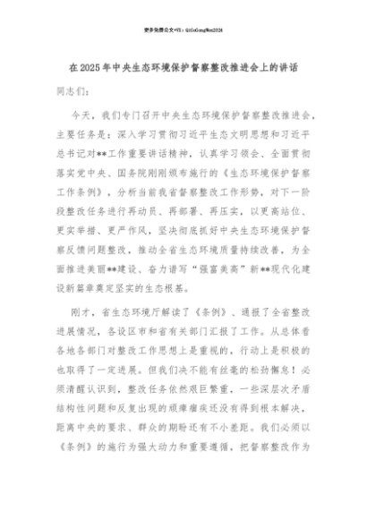 【七哥公文】2025年:【七哥公文】在2025年中央生态环境保护督察整改推进会上的讲话+更多免费公文+VX:QiGeGongWen2024+更多免费公文+VX:QiGeGongWen2024