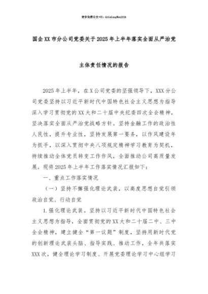 【七哥公文】2025年:【七哥公文】国企XX市分公司党委关于2025年上半年落实全面从严治党主体责任情况的报告+更多免费公文+VX:QiGeGongWen2024+更多免费公文+VX:QiGeGongWen2024