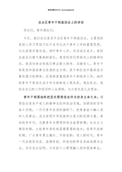 【七哥公文】2025年:【七哥公文】在全区青年干部座谈会上的讲话+更多免费公文+VX:QiGeGongWen2024+更多免费公文+VX:QiGeGongWen2024