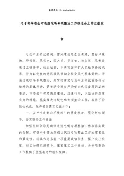 【七哥公文】2025年:【七哥公文】老干部局在全市违规吃喝专项整治工作推进会上的汇报发言+更多免费公文+VX:QiGeGongWen2024+更多免费公文+VX:QiGeGongWen2024