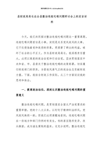 【七哥公文】2025年:【七哥公文】县财政局局长在全县整治违规吃喝问题研讨会上的发言材料+更多免费公文+VX:QiGeGongWen2024+更多免费公文+VX:QiGeGongWen2024
