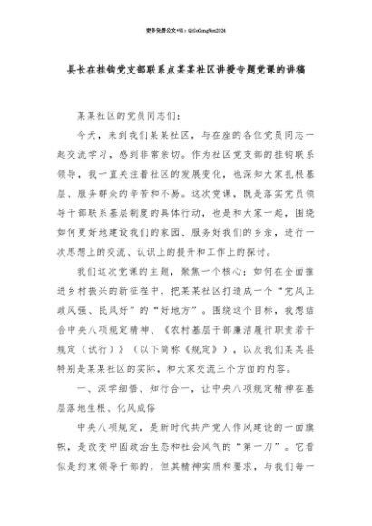 【七哥公文】2025年:【七哥公文】县长在挂钩党支部联系点某某社区讲授专题党课的讲稿+更多免费公文+VX:QiGeGongWen2024+更多免费公文+VX:QiGeGongWen2024