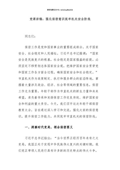 【七哥公文】2025年:【七哥公文】党课讲稿:强化保密意识筑牢机关安全防线+更多免费公文+VX:QiGeGongWen2024+更多免费公文+VX:QiGeGongWen2024