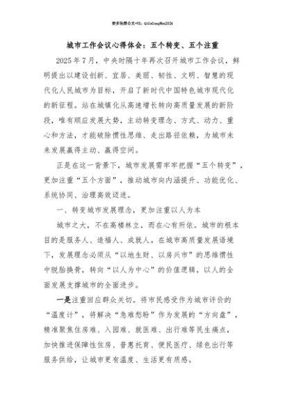 【七哥公文】2025年:【七哥公文】城市工作会议心得体会:五个转变、五个注重+更多免费公文+VX:QiGeGongWen2024+更多免费公文+VX:QiGeGongWen2024