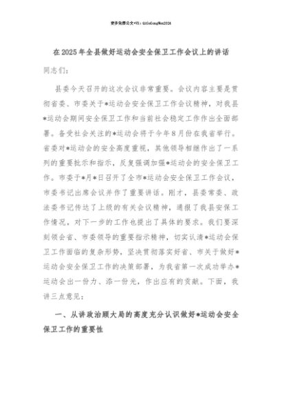 【七哥公文】2025年:【七哥公文】在2025年全县做好运动会安全保卫工作会议上的讲话+更多免费公文+VX:QiGeGongWen2024+更多免费公文+VX:QiGeGongWen2024