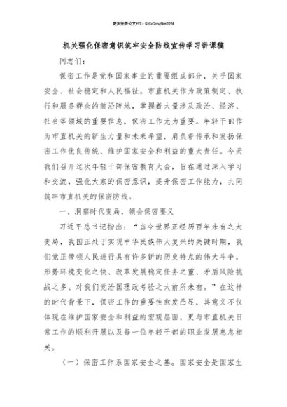【七哥公文】2025年:【七哥公文】机关强化保密意识筑牢安全防线宣传学习讲课稿+更多免费公文+VX:QiGeGongWen2024+更多免费公文+VX:QiGeGongWen2024