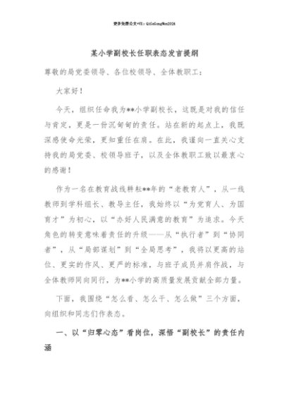 【七哥公文】2025年:【七哥公文】某小学副校长任职表态发言提纲+更多免费公文+VX:QiGeGongWen2024+更多免费公文+VX:QiGeGongWen2024