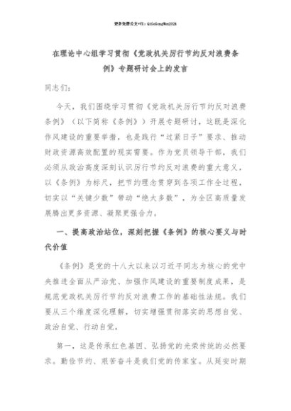 【七哥公文】2025年:【七哥公文】在理论中心组学习贯彻《党政机关厉行节约反对浪费条例》专题研讨会上的发言+更多免费公文+VX:QiGeGongWen2024+更多免费公文+VX:QiGeGongWen2024