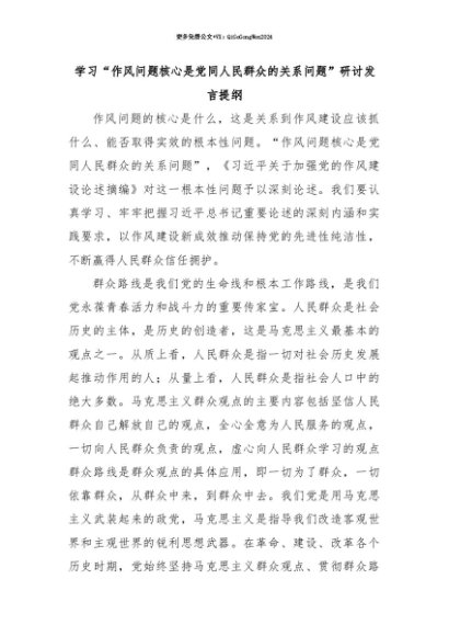 【七哥公文】2025年:【七哥公文】学习“作风问题核心是党同人民群众的关系问题”研讨发言提纲+更多免费公文+VX:QiGeGongWen2024+更多免费公文+VX:QiGeGongWen2024