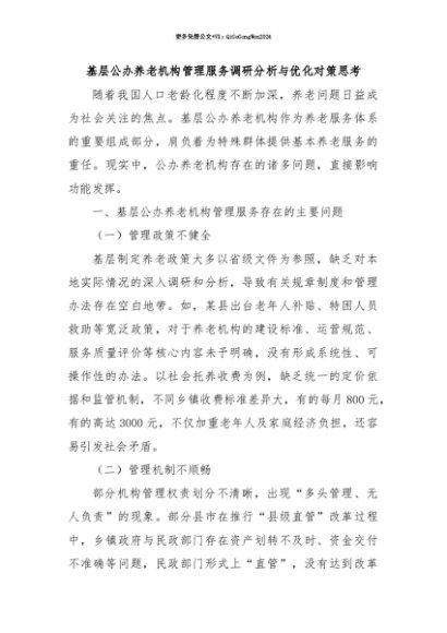 【七哥公文】2025年:【七哥公文】基层公办养老机构管理服务调研分析与优化对策思考+更多免费公文+VX:QiGeGongWen2024+更多免费公文+VX:QiGeGongWen2024