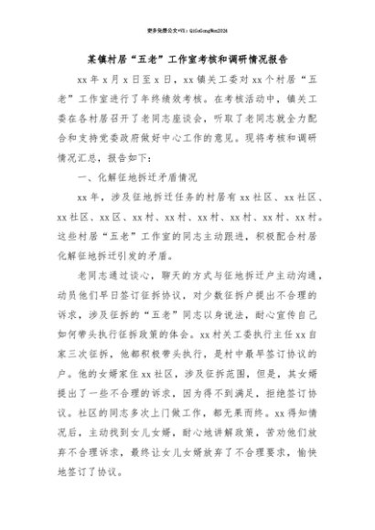【七哥公文】2025年:【七哥公文】某镇村居“五老”工作室考核和调研情况报告+更多免费公文+VX:QiGeGongWen2024+更多免费公文+VX:QiGeGongWen2024