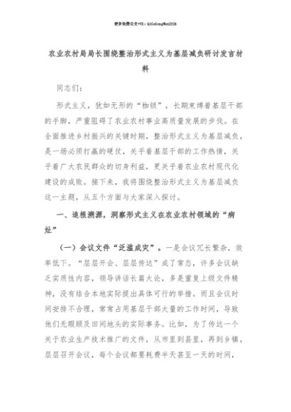 【七哥公文】2025年:【七哥公文】农业农村局局长围绕整治形式主义为基层减负研讨发言材料+更多免费公文+VX:QiGeGongWen2024+更多免费公文+VX:QiGeGongWen2024