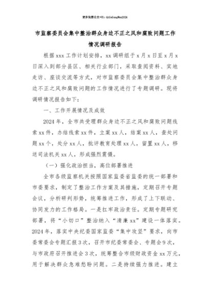 【七哥公文】2025年:【七哥公文】市监察委员会集中整治群众身边不正之风和腐败问题工作情况调研报告+更多免费公文+VX:QiGeGongWen2024+更多免费公文+VX:QiGeGongWen2024