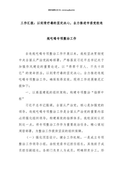 【七哥公文】2025年:【七哥公文】工作汇报:以刮骨疗毒的坚定决心,全力推进市委党校违规吃喝专项整治工作+更多免费公文+VX:QiGeGongWen2024+更多免费公文+VX:QiGeGongWen2024