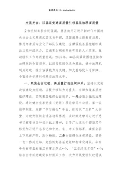 【七哥公文】2025年:【七哥公文】交流发言:以基层党建高质量引领基层治理高质量+更多免费公文+VX:QiGeGongWen2024+更多免费公文+VX:QiGeGongWen2024