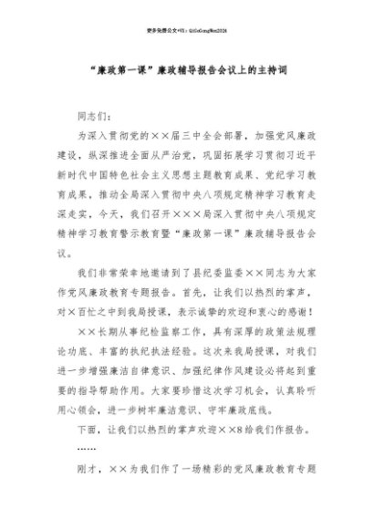 【七哥公文】2025年:【七哥公文】“廉政第一课”廉政辅导报告会议上的主持词+更多免费公文+VX:QiGeGongWen2024+更多免费公文+VX:QiGeGongWen2024