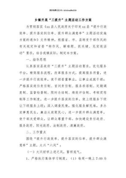 【七哥公文】2025年:【七哥公文】乡镇开展“三提升”主题活动工作方案+更多免费公文+VX:QiGeGongWen2024+更多免费公文+VX:QiGeGongWen2024
