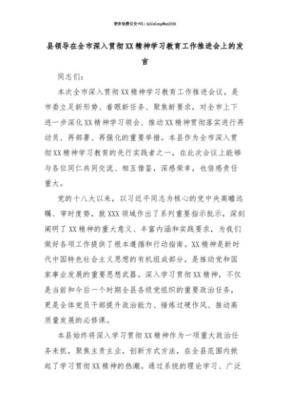 【七哥公文】2025年:【七哥公文】县领导在全市深入贯彻XX精神学习教育工作推进会上的发言+更多免费公文+VX:QiGeGongWen2024+更多免费公文+VX:QiGeGongWen2024
