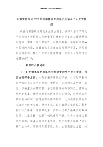 【七哥公文】2025年:【七哥公文】乡镇党委书记2025年巡察整改专题民主生活会个人发言提纲+更多免费公文+VX:QiGeGongWen2024+更多免费公文+VX:QiGeGongWen2024