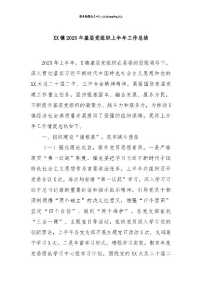 【七哥公文】2025年:【七哥公文】XX镇2025年基层党组织上半年工作总结+更多免费公文+VX:QiGeGongWen2024+更多免费公文+VX:QiGeGongWen2024