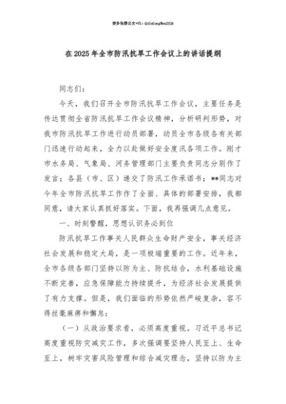 【七哥公文】2025年:【七哥公文】在2025年全市防汛抗旱工作会议上的讲话提纲+更多免费公文+VX:QiGeGongWen2024+更多免费公文+VX:QiGeGongWen2024