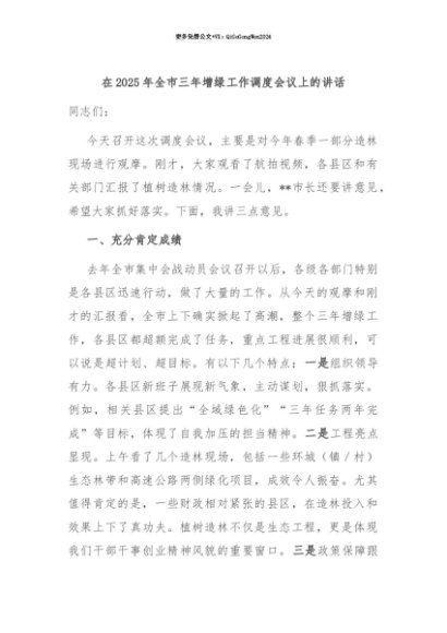 【七哥公文】2025年:【七哥公文】在2025年全市三年增绿工作调度会议上的讲话+更多免费公文+VX:QiGeGongWen2024+更多免费公文+VX:QiGeGongWen2024