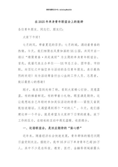 【七哥公文】2025年:【七哥公文】在2025年单身青年联谊会上的致辞+更多免费公文+VX:QiGeGongWen2024+更多免费公文+VX:QiGeGongWen2024