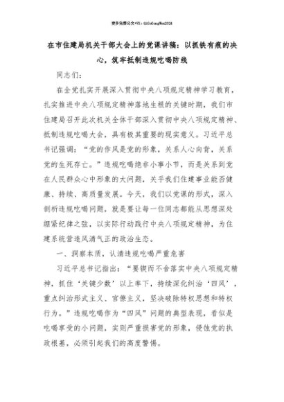 【七哥公文】2025年:【七哥公文】在市住建局机关干部大会上的党课讲稿:以抓铁有痕的决心,筑牢抵制违规吃喝防线+更多免费公文+VX:QiGeGongWen2024+更多免费公文+VX:QiGeGongWen2024