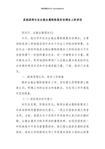 【七哥公文】2025年:【七哥公文】县统战部长在台胞台属联络服务协调会上的讲话+更多免费公文+VX:QiGeGongWen2024+更多免费公文+VX:QiGeGongWen2024