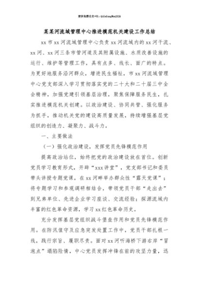 【七哥公文】2025年:【七哥公文】某某河流域管理中心推进模范机关建设工作总结+更多免费公文+VX:QiGeGongWen2024+更多免费公文+VX:QiGeGongWen2024