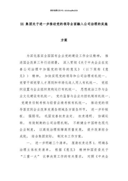 【七哥公文】2025年:【七哥公文】XX 集团关于进一步推动党的领导全面融入公司治理的实施方案+更多免费公文+VX:QiGeGongWen2024+更多免费公文+VX:QiGeGongWen2024