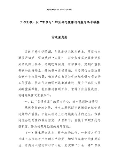 【七哥公文】2025年:【七哥公文】工作汇报:以“零容忍”的坚决态度推动违规吃喝专项整治走深走实+更多免费公文+VX:QiGeGongWen2024+更多免费公文+VX:QiGeGongWen2024