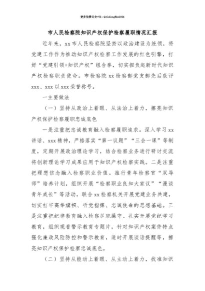 【七哥公文】2025年:【七哥公文】市人民检察院知识产权保护检察履职情况汇报+更多免费公文+VX:QiGeGongWen2024+更多免费公文+VX:QiGeGongWen2024