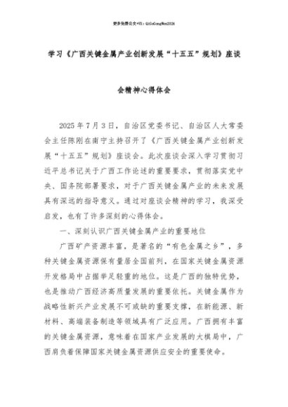 【七哥公文】2025年:【七哥公文】学习《广西关键金属产业创新发展“十五五”规划》座谈会精神心得体会+更多免费公文+VX:QiGeGongWen2024+更多免费公文+VX:QiGeGongWen2024