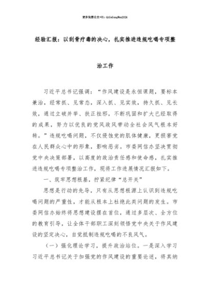 【七哥公文】2025年:【七哥公文】经验汇报:以刮骨疗毒的决心,扎实推进违规吃喝专项整治工作+更多免费公文+VX:QiGeGongWen2024+更多免费公文+VX:QiGeGongWen2024
