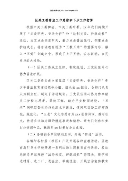 【七哥公文】2025年:【七哥公文】区关工委普法工作总结和下步工作打算+更多免费公文+VX:QiGeGongWen2024+更多免费公文+VX:QiGeGongWen2024