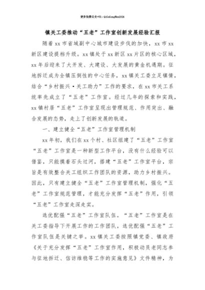 【七哥公文】2025年:【七哥公文】镇关工委推动“五老”工作室创新发展经验汇报+更多免费公文+VX:QiGeGongWen2024+更多免费公文+VX:QiGeGongWen2024