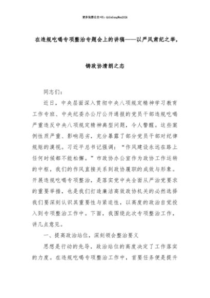 【七哥公文】2025年:【七哥公文】在违规吃喝专项整治专题会上的讲稿——以严风肃纪之举,铸政协清朗之态+更多免费公文+VX:QiGeGongWen2024+更多免费公文+VX:QiGeGongWen2024