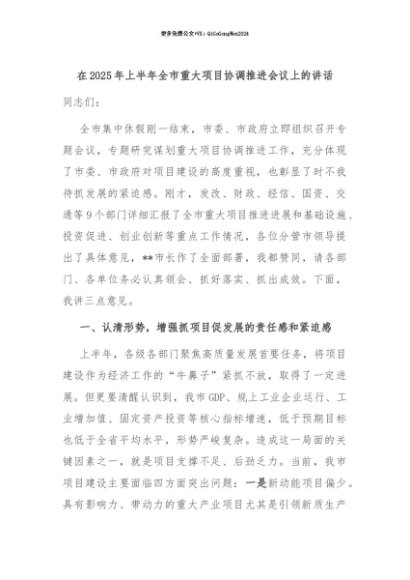 【七哥公文】2025年:【七哥公文】在2025年上半年全市重大项目协调推进会议上的讲话+更多免费公文+VX:QiGeGongWen2024+更多免费公文+VX:QiGeGongWen2024