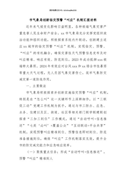 【七哥公文】2025年:【七哥公文】市气象局创新临灾预警“叫应”机制汇报材料+更多免费公文+VX:QiGeGongWen2024+更多免费公文+VX:QiGeGongWen2024