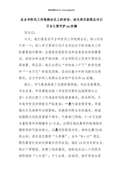 【七哥公文】2025年:【七哥公文】在全市防汛工作视频会议上的讲话:枕戈待旦极限应对以万全之策守护xx安澜+更多免费公文+VX:QiGeGongWen2024+更多免费公文+VX:QiGeGongWen2024