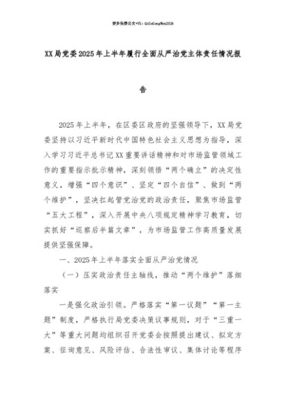 【七哥公文】2025年:【七哥公文】XX局党委2025年上半年履行全面从严治党主体责任情况报告+更多免费公文+VX:QiGeGongWen2024+更多免费公文+VX:QiGeGongWen2024
