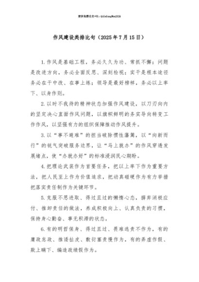 【七哥公文】2025年:【七哥公文】作风建设类排比句(2025年7月15日)+更多免费公文+VX:QiGeGongWen2024+更多免费公文+VX:QiGeGongWen2024