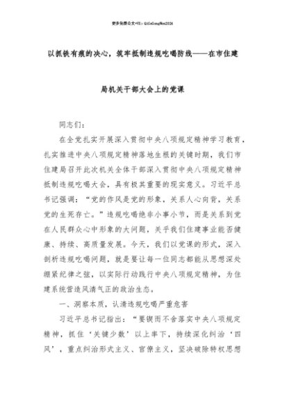 【七哥公文】2025年:【七哥公文】以抓铁有痕的决心,筑牢抵制违规吃喝防线——在市住建局机关干部大会上的党课+更多免费公文+VX:QiGeGongWen2024+更多免费公文+VX:QiGeGongWen2024