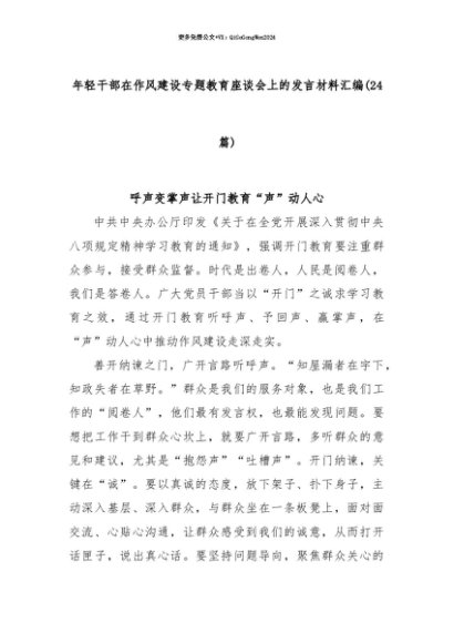 【七哥公文】2025年:【七哥公文】(24篇)年轻干部在作风建设专题教育座谈会上的发言材料汇编+更多免费公文+VX:QiGeGongWen2024+更多免费公文+VX:QiGeGongWen2024